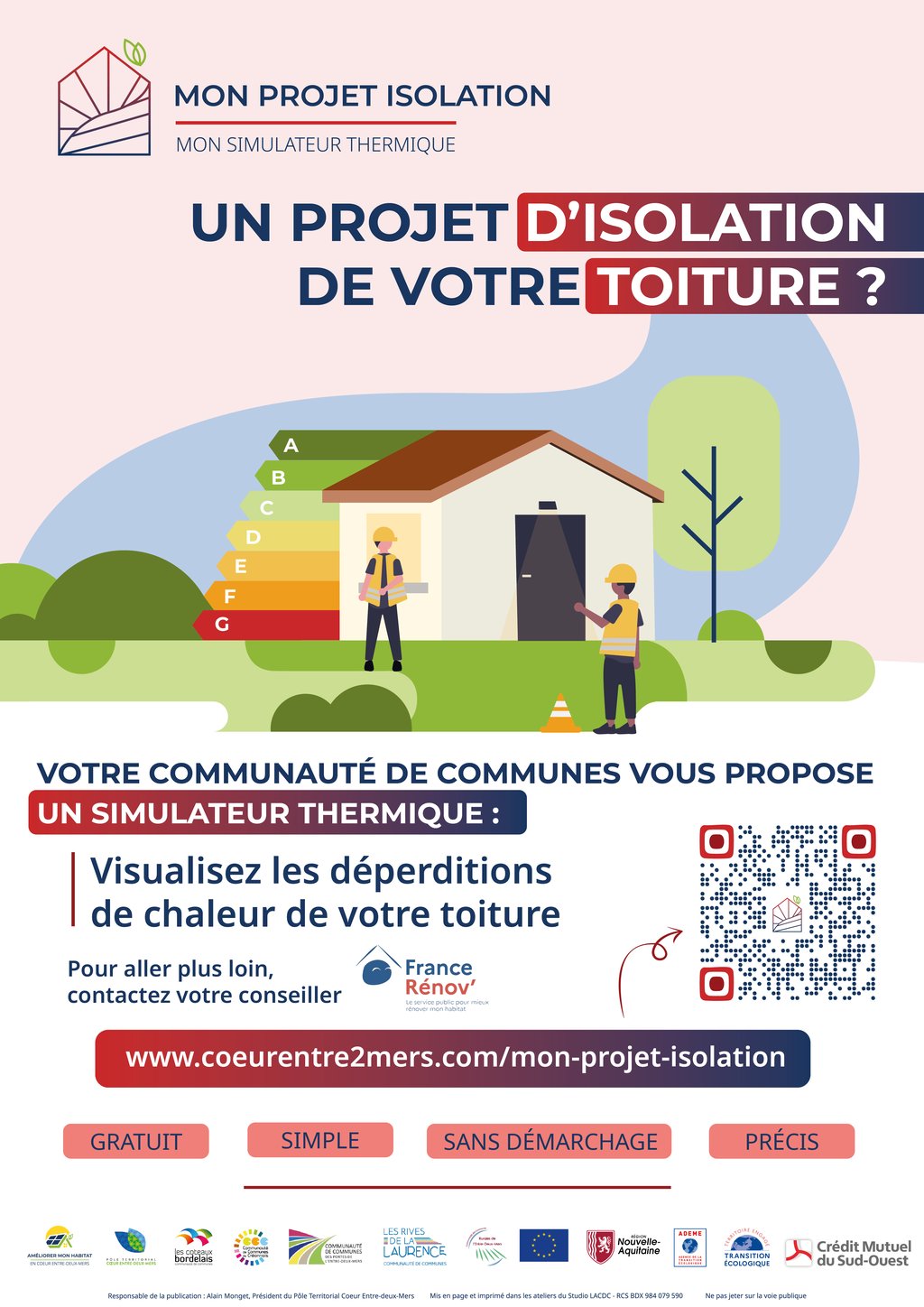 Les communautés de communes et le Pôle Territorial du Cœur Entre-deux-Mers lancent « Mon projet isolation – Mon simulateur thermique » : un outil 🛠️ simple et gratuit qui, à partir de votre adresse, estime la performance thermique de votre toiture et identifie les pertes de chaleur.