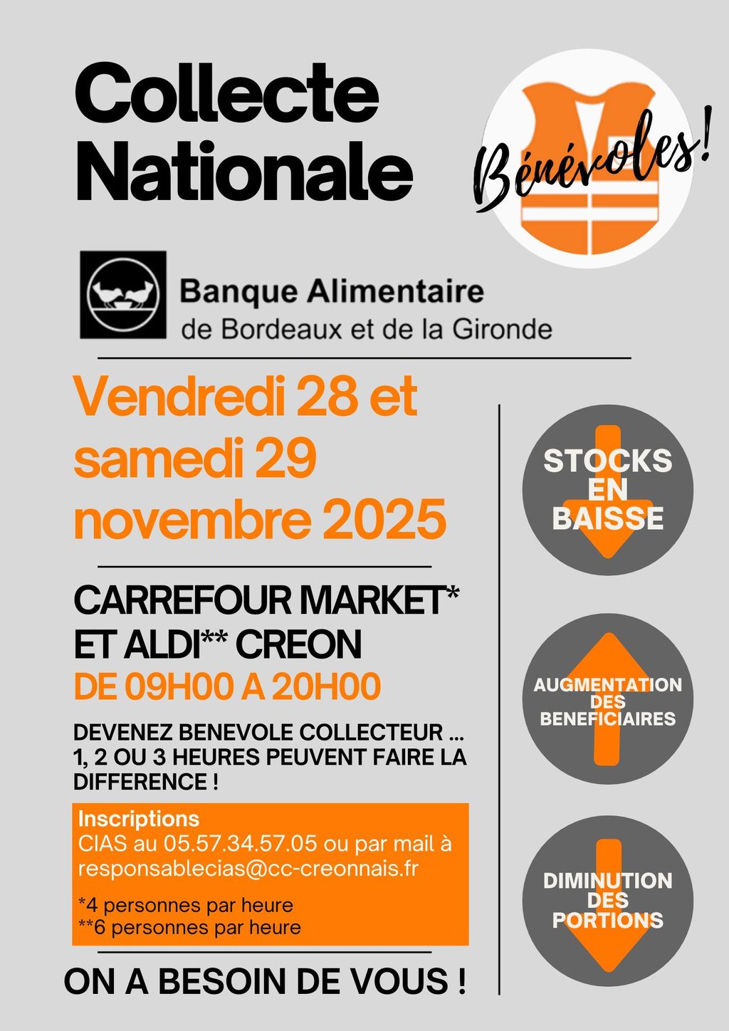La collecte de la Banque Alimentaire de Bordeaux se déroulera les 28,29 et 30 novembre prochains dans plus de 212 magasins et assurée par plus de 1 000 gilets orange.