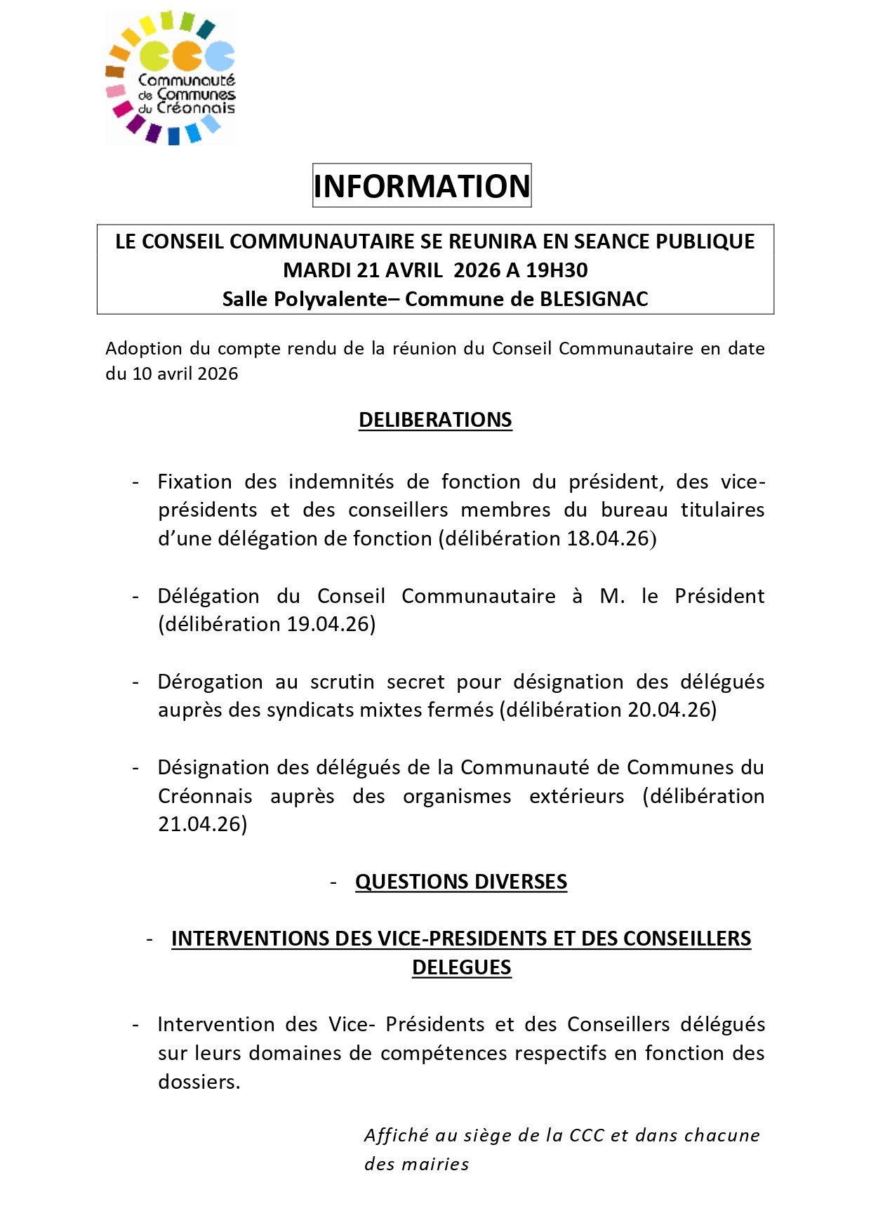 [Conseil communautaire] - mardi 21 avril 2026