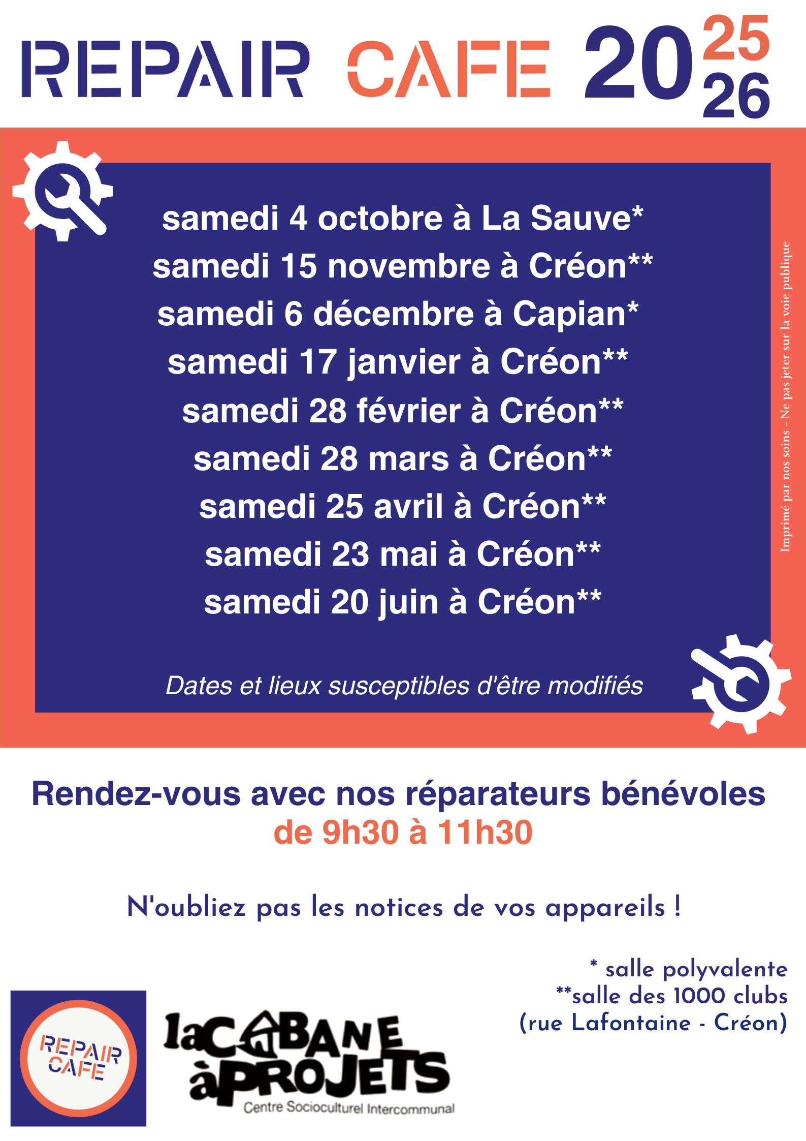 Si on devait traduire cet anglicisme en Français cela donnerait « Café de réparation » mais bien souvent il ne s’agit pas d’un « Café » mais d’un lieu mis à la disposition des associations par les mairies. Concernant le « Repair Café du Créonnais », organisé par la Cabane à Projets c’est dans une des salles de la communauté de communes que les séances se déroulent un samedi matin par mois.