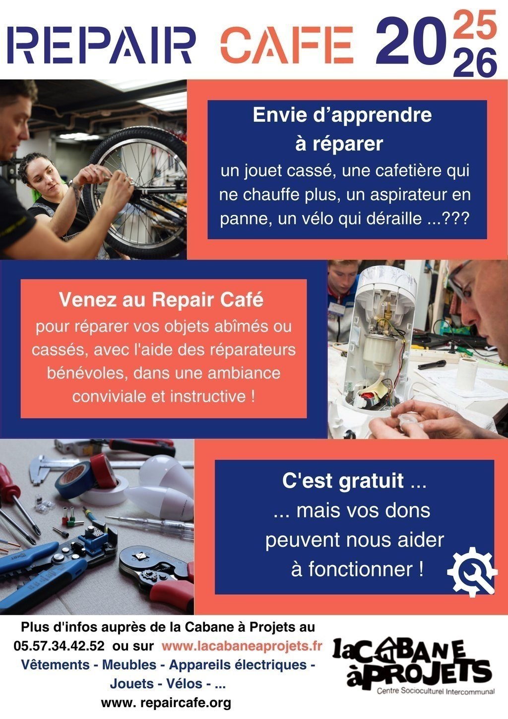 - Si vous n’avez pas d’objets à réparer mais que vous êtes intéressé(e)s par ce projet, vous pouvez aussi passer pour en discuter autour d’un café ou nous appeler au 05 57 34 42 52.
