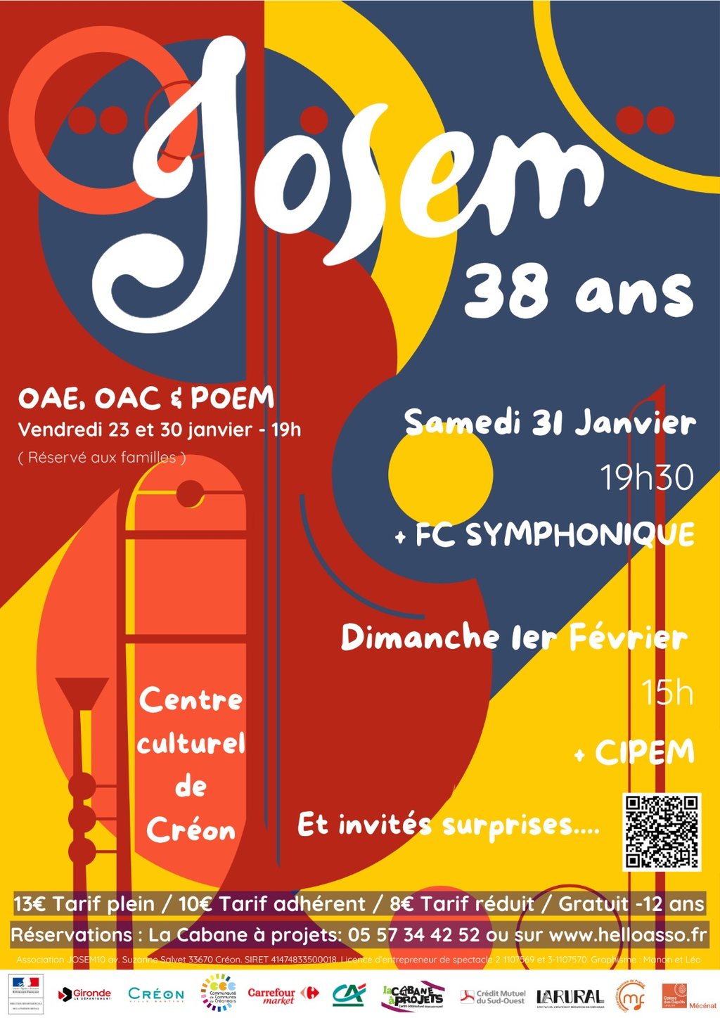 Samedi 31 janvier à 19h30 : l’orchestre du JOSEM partagera la scène avec le FC Symphonique, l’orchestre des musiciens adultes de l’association. De nombreux invités surprises viendront animer la scène tout au long de la soirée.