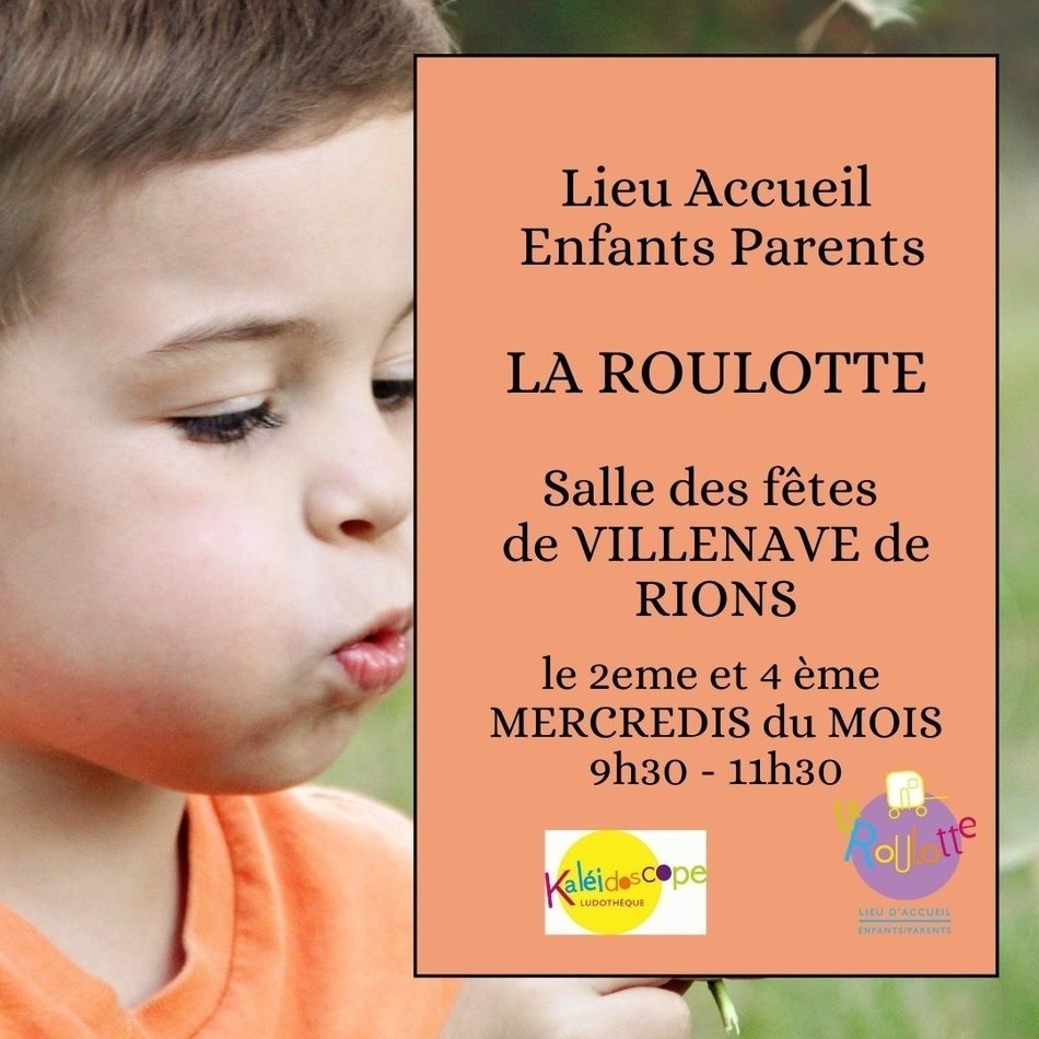 Le Lieu d'Accueil Enfants Parents "La Roulotte" se trouvera à la salle des fêtes de Villenave-de-Rions le mercredi 28 janvier de 9h30 à 12h.