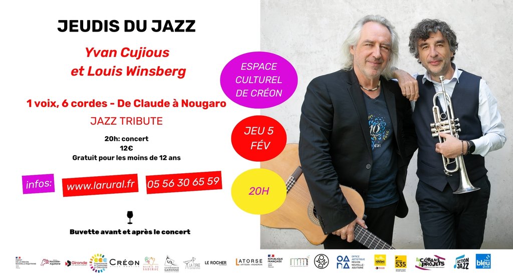 20 ans après la disparition de Claude Nougaro et 30 ans après son album mythique, 1Voix 10Doigts, Yvan Cujious et Louis Winsberg lui rendent hommage avec 1 voix, 6 cordes. Le duo revisite en guitare-voix l’incroyable répertoire qu’on a plus souvent l’habitude d’entendre au piano. Yvan Cujious est repéré par Claude Nougaro en 1996, à Toulouse, lors d’un concours de chanson qu’il a remporté et dont Claude était le Président du jury. Dès lors, les deux musiciens sont amenés à se rapprocher, et collaborent sur de nombreux projets. En 2004, au décès de Claude, Yvan fonde, avec Hélène Nougaro, l’Association Claude Nougaro dont il prend la direction artistique jusqu’en 2009. Cependant, il n’avait jamais consacré un spectacle entier à son (re)père spirituel. Il fallait attendre le moment, la rencontre. Elle est arrivée par Louis Winsberg. Ce dernier, musicien très recherché sur la scène jazz, fondateur du groupe Sixun, avait aussi joué avec Nougaro. Ensemble, les deux hommes se sont embarqués dans ce projet de haut vol, qui retrace l'esprit de "l’homme aux semelles de swing". Dans ce concert-spectacle, entre performances virtuoses et textes inédits, stand-up et concert de jazz, on pleure, on chante, on rit, et puis on frissonne !
