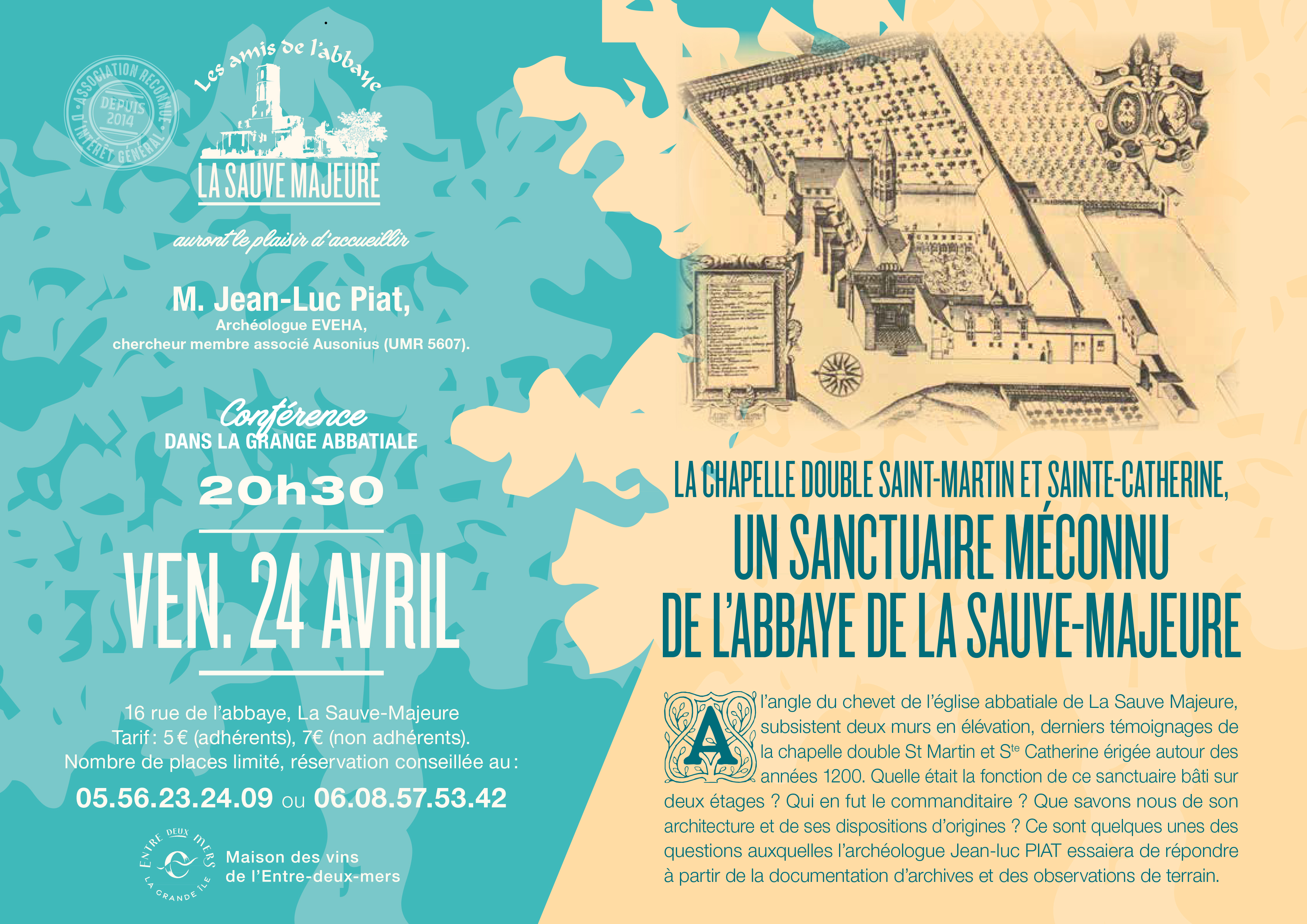 « À l’angle du chevet de l'église abbatiale de La Sauve Majeure, subsistent deux murs en élévation, derniers témoignages de la chapelle double St Martin et Ste Catherine érigée autour des années 1200. Quelle était la fonction de ce sanctuaire bâti sur deux étages ? Qui en fut le commanditaire ? Que savons nous de son architecture et de ses dispositions d'origines ? Ce sont quelques unes des questions auxquelles l'archéologue Jean-luc PIAT essaiera de répondre à partir de la documentation d'archives et des observations de terrain.