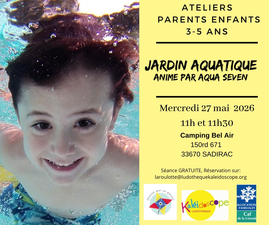 L'association Kaléidoscope vous propose une séance d'aisance aquatique pour les enfants âgés de 3 à 5 ans accompagnés d'un parent ou d'un adulte référent, mercredi 27 mai de 11h à 11h30 et de 11h30 à 12h (2 créneaux proposés).