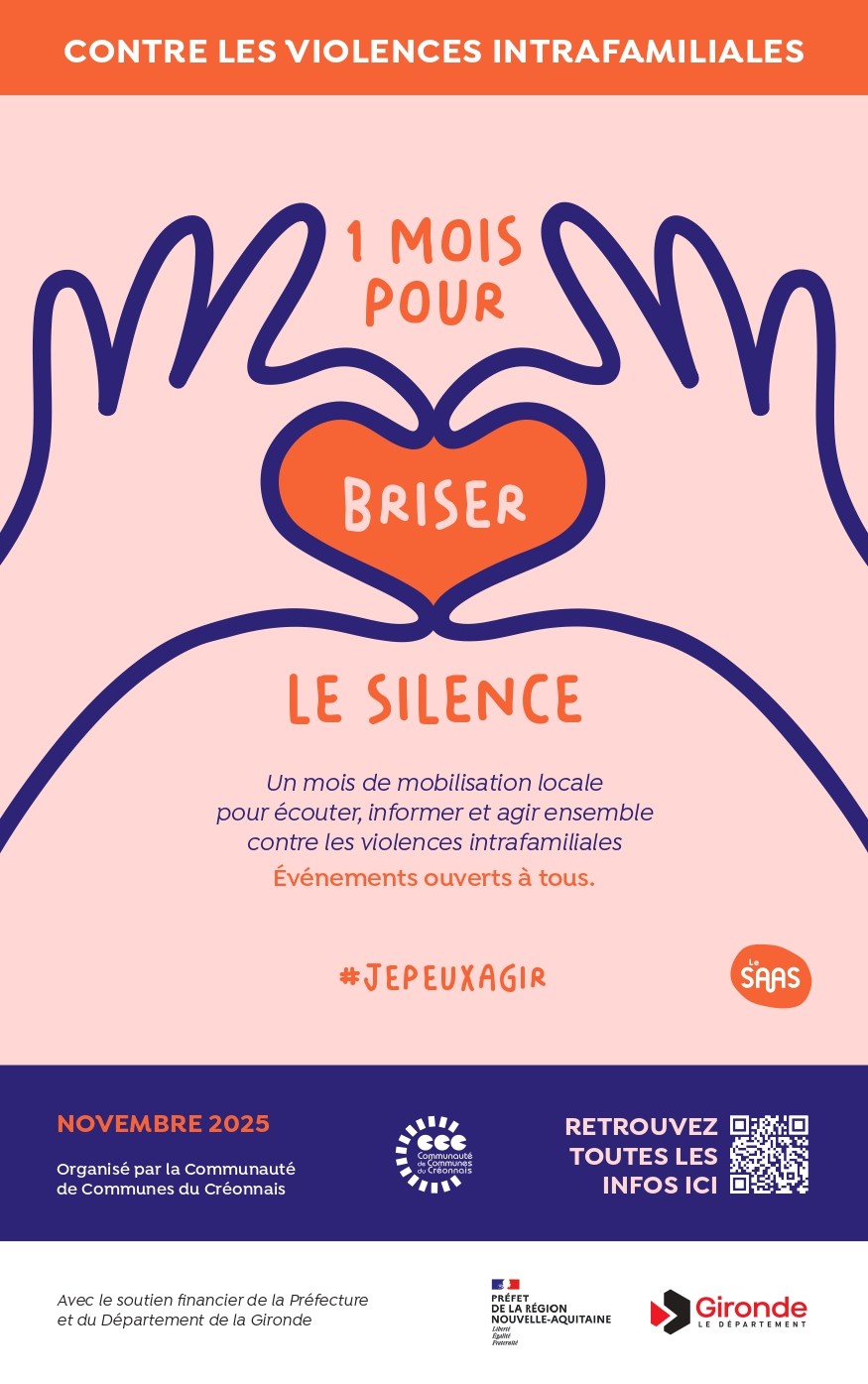 C'est pourquoi nous lançons, en novembre 2025, « Un mois pour briser le silence », une campagne de sensibilisation sans précédent. Pour la première fois, le Créonnais met en place un événement d'une telle ampleur, grâce à la mobilisation de plus de 20 partenaires locaux, incluant la gendarmerie, le CIDFF, les services sociaux, les élus, et de nombreuses associations.